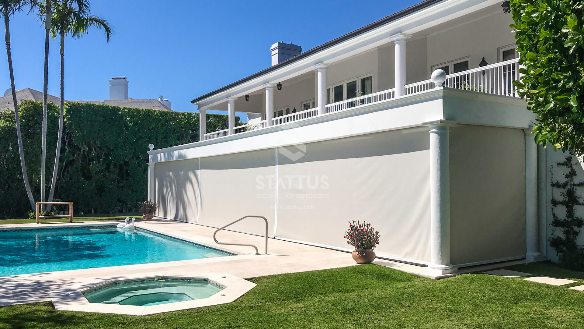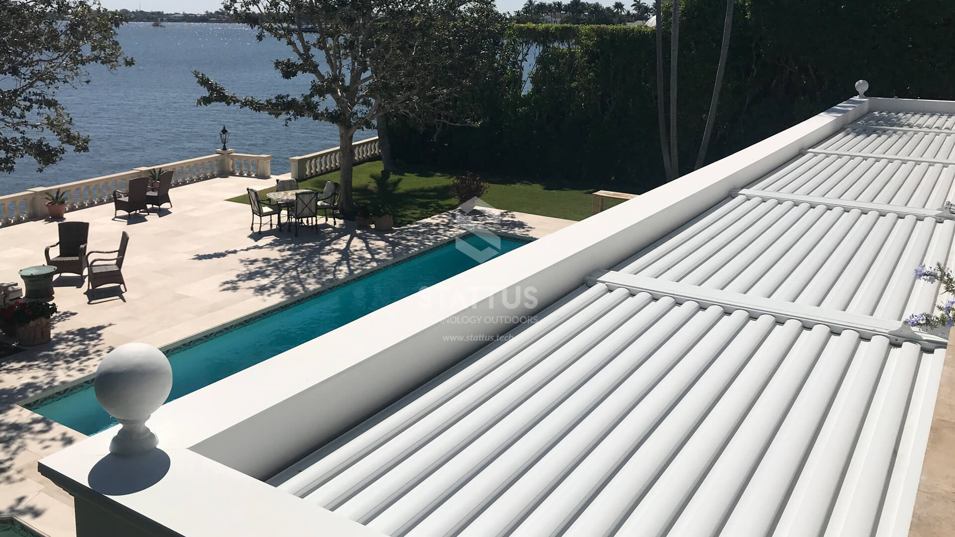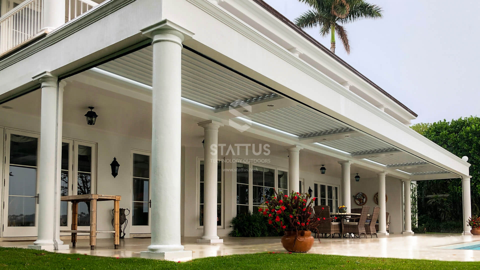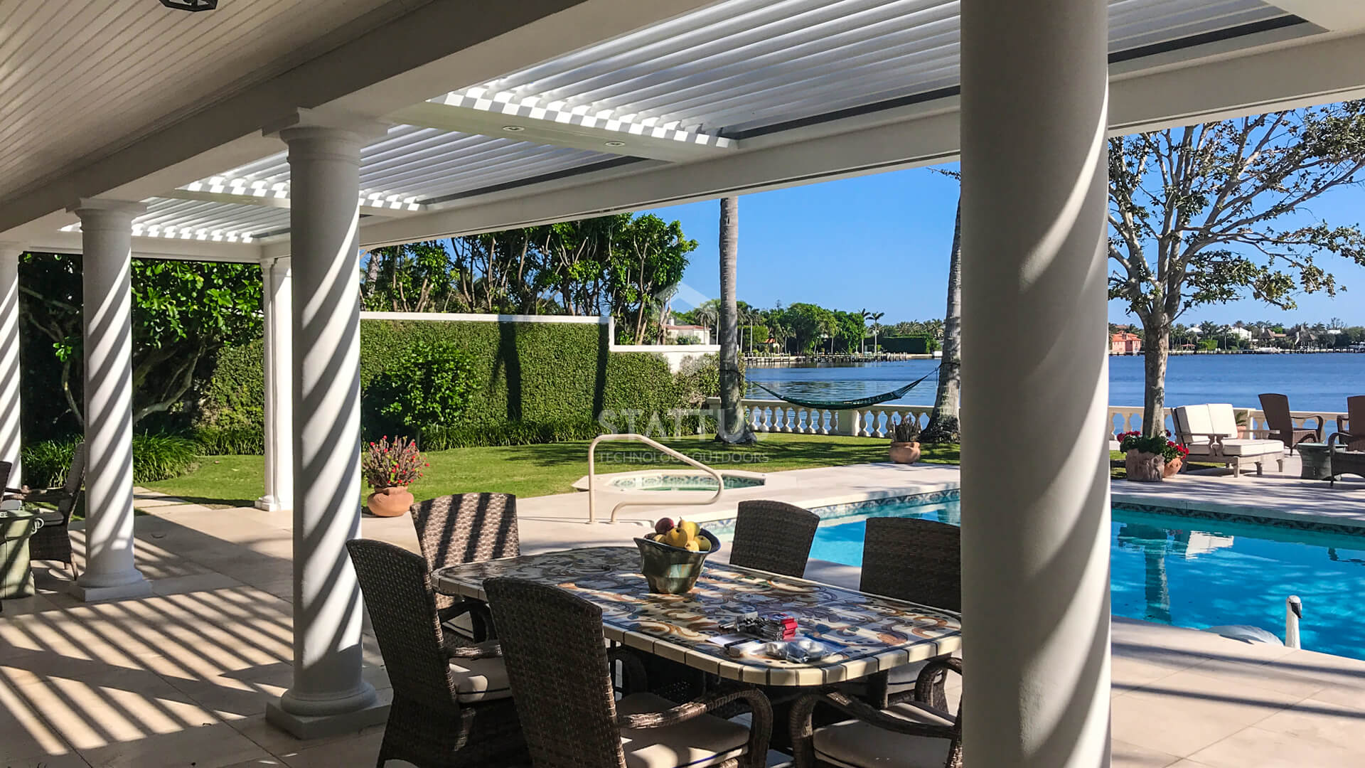 This was one of our first projects done in Palm Beach, FL. In which, we sought to continue the architectural style of the house with the pergola. The result: This stunning Motorized Pergola that extends the entire length of the house.